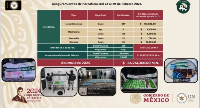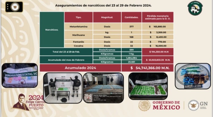 Los narcóticos confiscados son metanfetamina, marihuana, fentanilo y cocaína, que del 23 al 29 de febrero acumularon 599 dosis aseguradas y representan 194 mil 350 pesos en pérdidas para el crimen organizado.