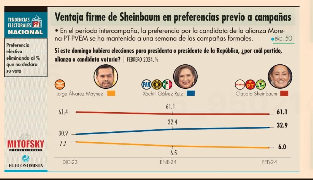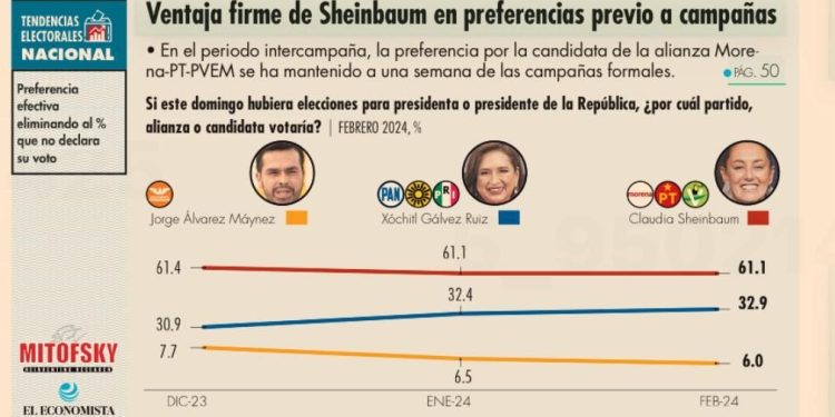 A una semana de que inicien las campañas de manera formal, Claudia Sheinbaum, candidata de la coalición de Morena, PT y PVEM a la Presidencia de la República, se mantiene en el primer lugar de las preferencias electorales con 51.6%; le sigue Xóchitl Gálvez, de la coalición del PAN, PRI y PRD, con 27.8%, y en tercer sitio se ubica, con 5.1%, el abanderado de MC, Jorge Álvarez Máynez.