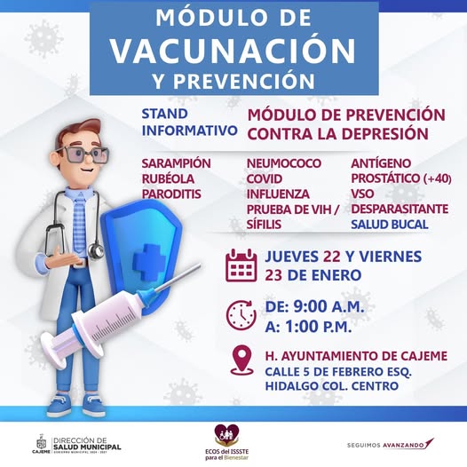 Acercamos servicios de Vacunación para proteger a la población de Cajeme con vacunas contra influenza, COVID-19, Prueba de VIH, sífilis, salud bucal, neumococo antígeno, sarampión, rubéola, paroditis, prostático (+40), VSO, desparasitante. Además de iniciar y completar esquemas básicos.