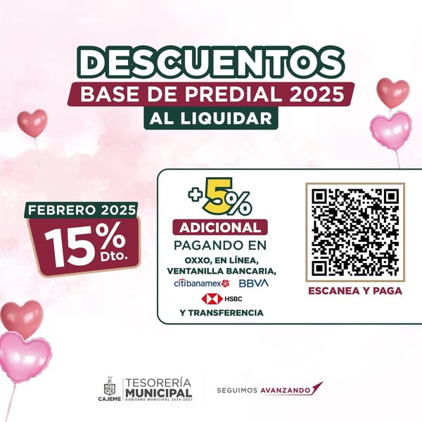 Por todo febrero 2025, Obtén 15% de descuento en base de predial, más un 5% adicional al pagar en línea, Oxxo, ventanilla bancaria y transferencias.