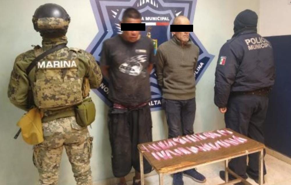 Sitio en el que dos personas al observar las unidades policiales emprendieron huida a fuerza de carrera, sin embargo, fueron detenidos rápidamente por elementos de la corporación, quienes al realizarles una revisión física les encontraron 44 envoltorios de una sustancia granulada al tacto y de color blanco con características similares a las de un narcótico, procediendo con la aprehensión de José Ángel “N.”, de 30 años y Lorenzo Javier “N.”, de 56 años, por la presunta comisión del delito contra la salud.