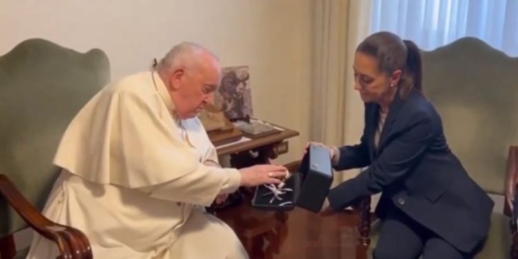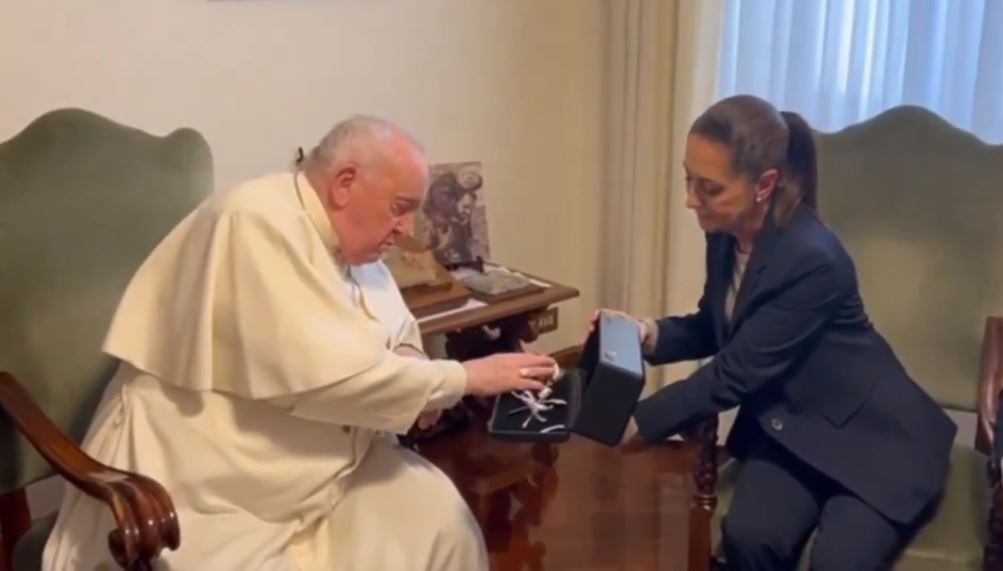 “Pensando en la devoción de las y los mexicanos por la Virgen de Guadalupe, le pedí al Papa Francisco que bendijera una rosa de plata elaborada por Adrian Pallarols para llevarla a México”, compartió Claudia Sheinbaum a través de sus redes sociales, donde mostró un fragmento sobre su reunión con el Papa Francisco.