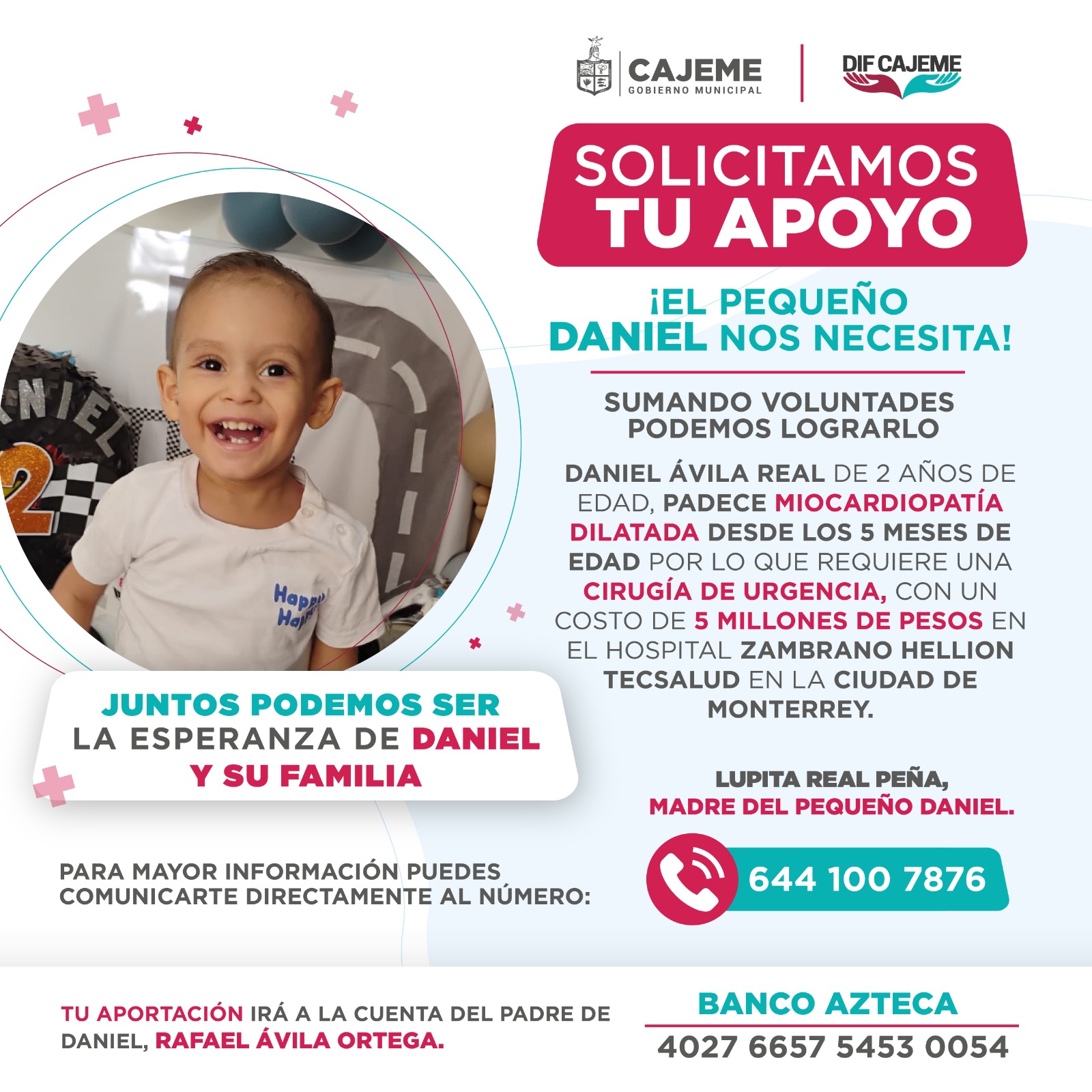 Para mayor información puedes comunicarte al 6441-06-78-76 con el señor Rafael Ávila padre del pequeño Daniel.