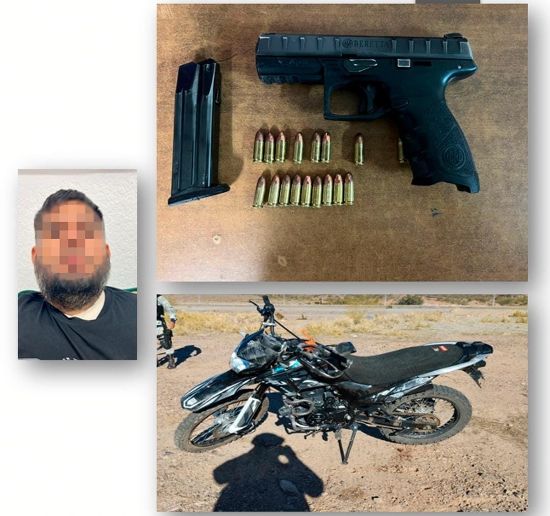 En el municipio de Sonoyta, personal de la Guardia Nacional y de la Secretaría de la Defensa Nacional (Sedena), lograron la detención de Ramón “N” a la altura del kilómetro uno de la carretera federal 2 tramo Sonoyta-San Luis Río Colorado, quien circulaba a bordo de una motocicleta, al momento del arresto traía consigo un arma de fuego calibre 9mm, un cargador y 17 cartuchos del mismo calibre.