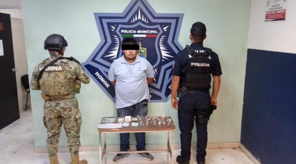 Durante operativos nocturnos para la prevención de los delitos, elementos de la Secretaría de Seguridad Pública y Marina, llevaron a cabo la captura de un hombre en la colonia Infonavit Yukujimari, a quien se le aseguraron de entre su vestimenta diversos envoltorios de cristal.