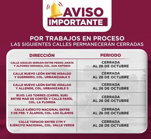 Por trabajos de rehabilitación, las siguientes calles permanecerán cerradas.