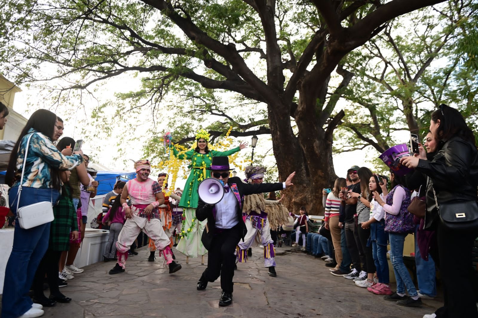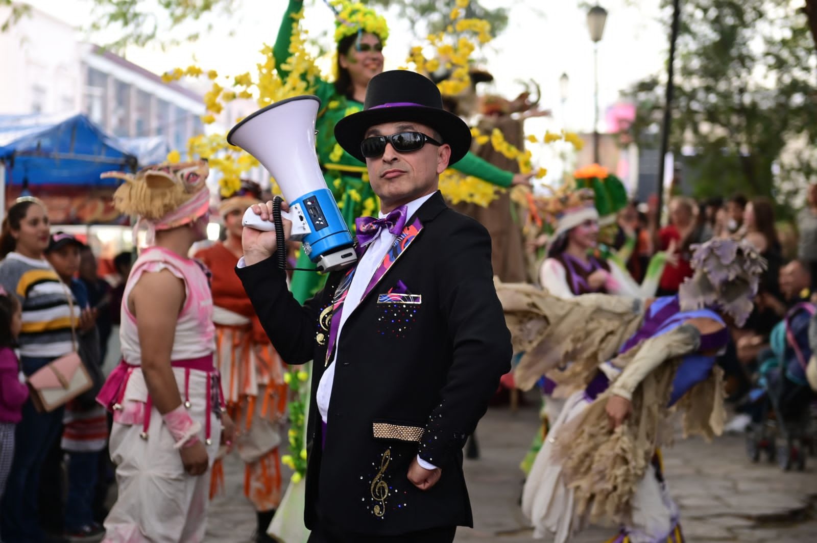 Álamos, Sonora; 27 de enero de 2024.- Vestido con traje de gala, sombrero de copa, megáfono en mano y con la marca del FAOT a sus espaldas, “El Pregonero” recorre las empedradas calles del Pueblo Mágico de Álamos para invitar a hombres y mujeres, niños y niñas, a que asistan a las diferentes presentaciones que conforman la 39 edición del Festival Alfonso Ortiz Tirado.