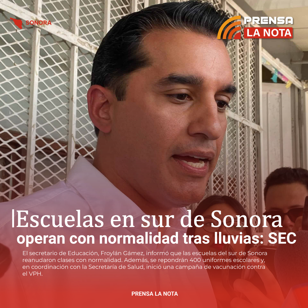 El secretario de Educación, Froylán Gámez, confirmó que los planteles en el sur de Sonora retomaron actividades sin contratiempos. Se repondrán 400 uniformes escolares y comenzó una campaña de vacunación contra el VPH en coordinación con la Secretaría de Salud.