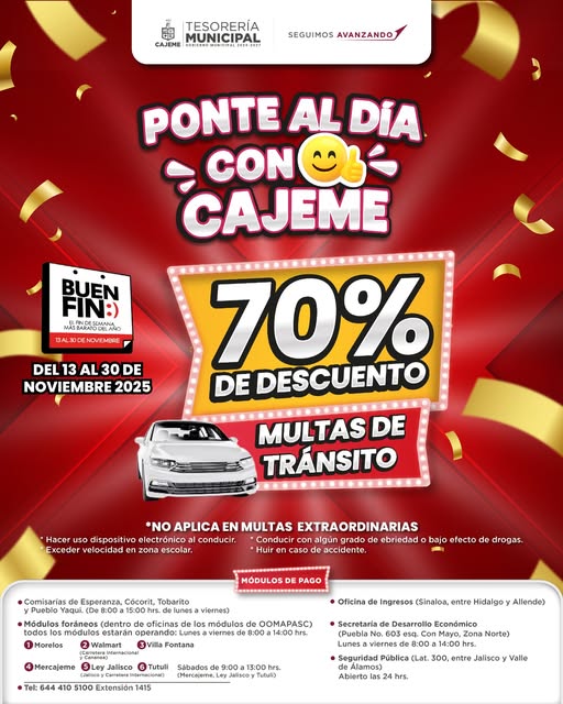 ¡Ponte al día con Cajeme, el buen fin que te conviene! Del 13 al 17 de noviembre aprovecha el 70% de descuento en multas de tránsito.