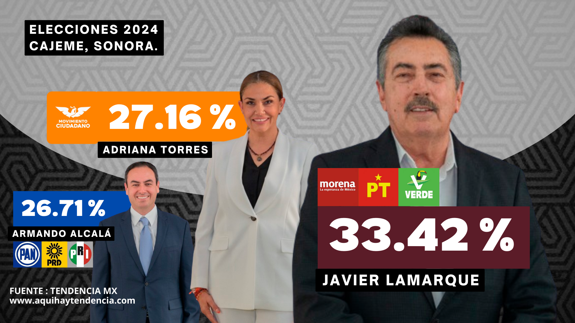 CD.OBREGÓN,SON.- El candidato a la presidencia municipal de Cajeme Javier Lamarque sigue liderando las encuestas tras el debate con el 33.42 %, seguido de Adriana Torres de MC con el 27.16 % y en tercer lugar Armando Alcalá PAN PRI PRD con el 26.71 %.