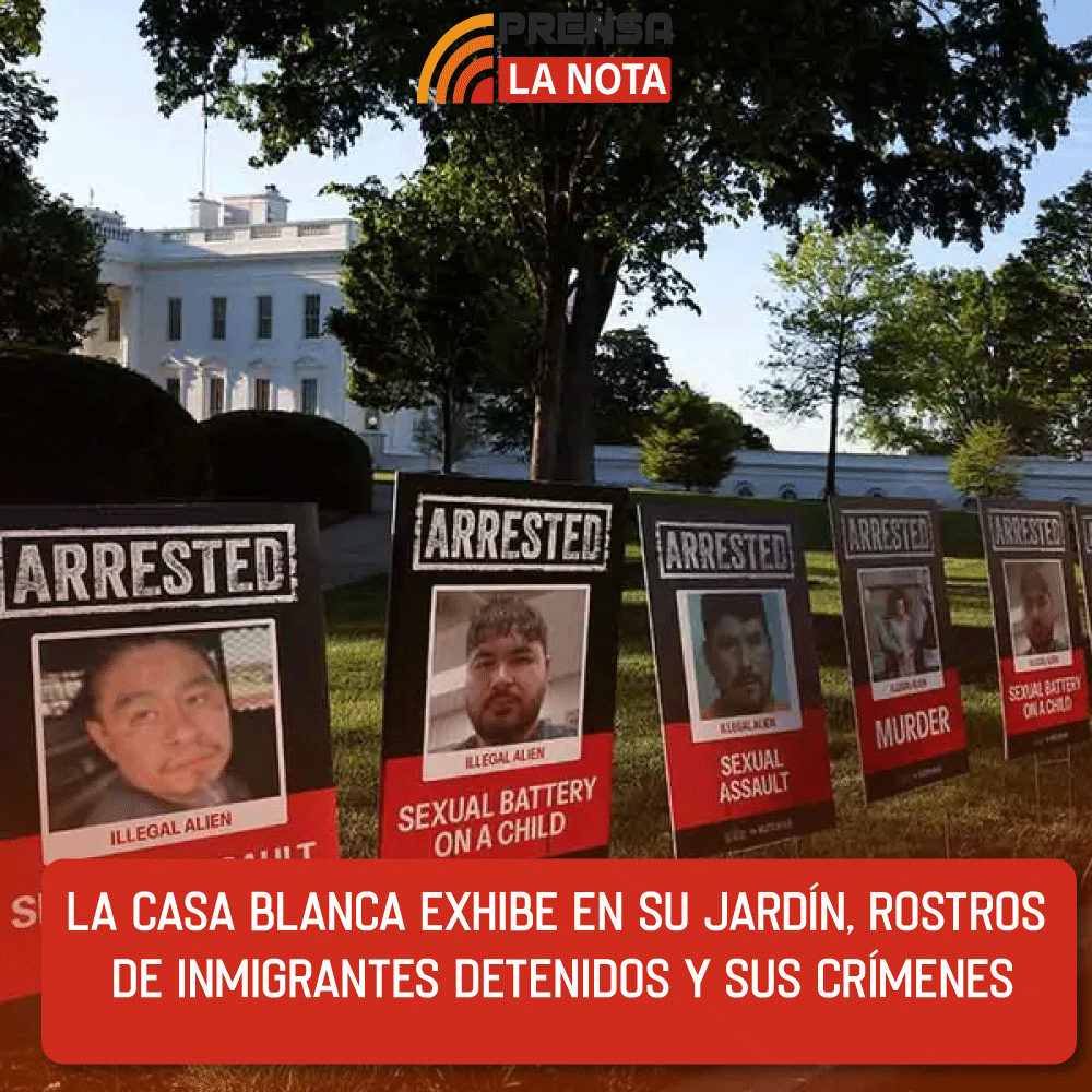 El césped de la Casa Blanca fue decorado con carteles al estilo de fotografías policiales que mostraban los rostros de 100 inmigrantes en situación irregular, presuntamente arrestados, junto con una lista de los delitos graves que algunos de ellos habrían cometido.