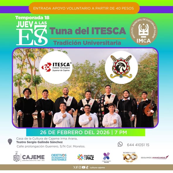 El Municipio de Cajeme y el IMCA te invitan a la Temporada 18 en la Casa de la Cultura. Disfruta de una cartelera llena de talento local para toda la familia.