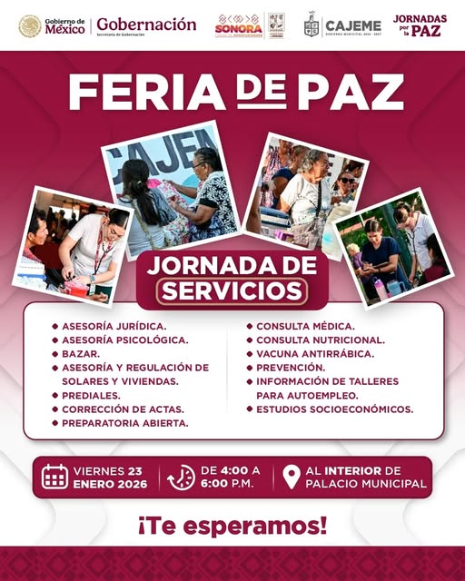 ¡La Feria de Paz en Cajeme llega a tu colonia! Ven y aprovecha los módulos de servicios y atenciones que las dependencias del Gobierno de México, del Estado de Sonora y el Municipio de Cajeme traen para ti y tu familia.