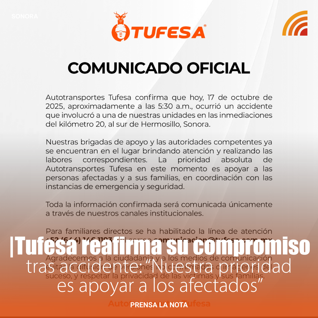 Autotransportes Tufesa confirmó mediante comunicado que aproximadamente a las 5:30 a.m. ocurrió un accidente que involucró a una de sus unidades en las inmediaciones del kilómetro 20, al sur de Hermosillo. Brigadas de la empresa y autoridades atienden en el sitio. El documento no detalla número de personas fallecidas o lesionadas.