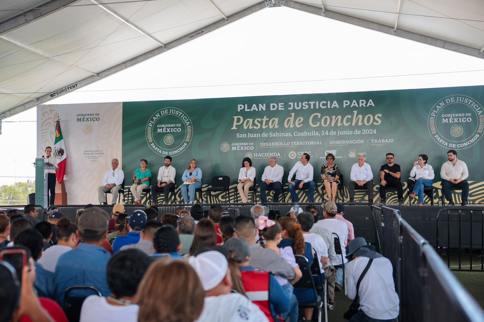 San Juan Sabinas, Coahuila, 14 de junio de 2024.- Ahora que lamentablemente se empezaron a encontrar restos de trabajadores mineros, [esto] ya indica que podemos rescatarlos a todos, como es el deseo de todos sus familiares, señaló el presidente Andrés Manuel López Obrador al encabezar la presentación de avances del Plan de Justicia para Pasta de Conchos, acompañado por la virtual presidenta electa, Claudia Sheinbaum Pardo.