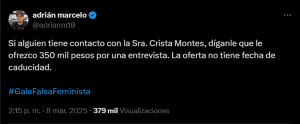 Adrián Marcelo no tardó en realizar una publicación al respecto y a través de la cuenta de X @adrianmarcelism compartió la controversial foto de él junto a la señora Montes donde afirma que el capítulo de su sección ‘Un Porro con’ de su canal de YouTube se estrenará el domingo 23 de marzo a las 19:00 horas de Monterrey, 18:00 horas de Sonora.