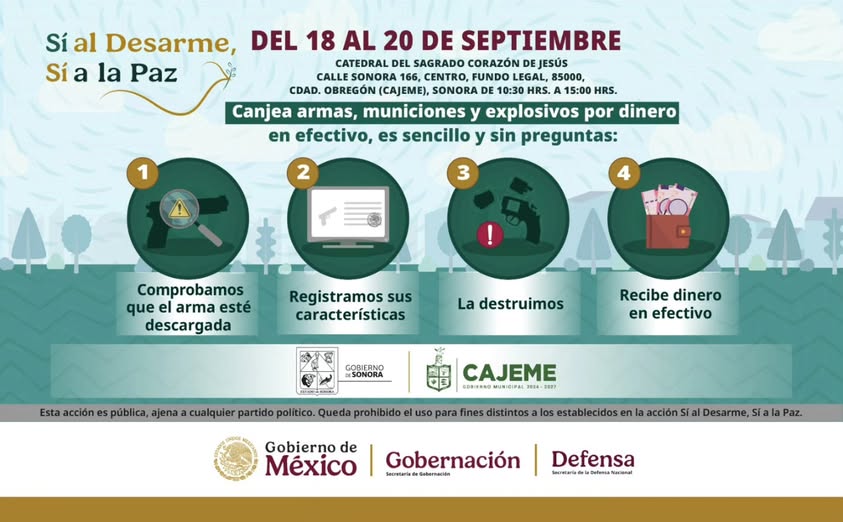 Te invitamos a acercarte y ser parte de esta jornada de desarme voluntario, porque juntas y juntos construimos un Cajeme más seguro y en paz.