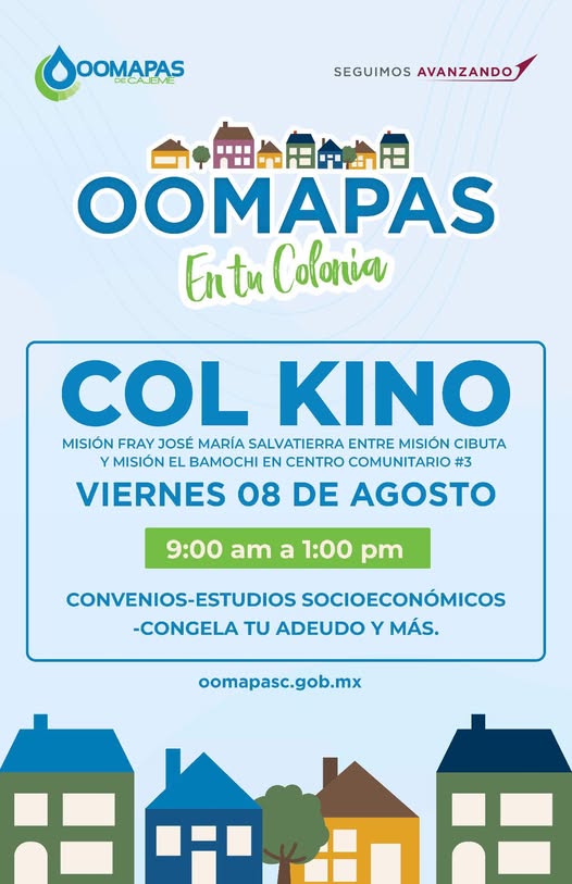 Este VIERNES 8 de AGOSTO estaremos en COLONIA KINO con nuestro módulo móvil para pago de recibo de agua, aclaraciones y convenios de pago.