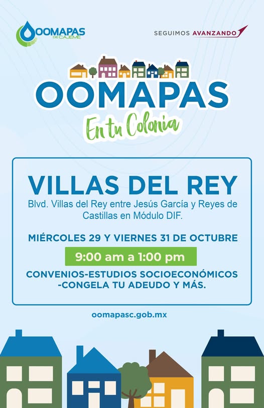 Este MIÉRCOLES 29 y VIERNES 31 de OCTUBRE estaremos en COLONIA VILLAS DEL REY con nuestro módulo móvil para pago de recibo de agua, aclaraciones y convenios de pago.