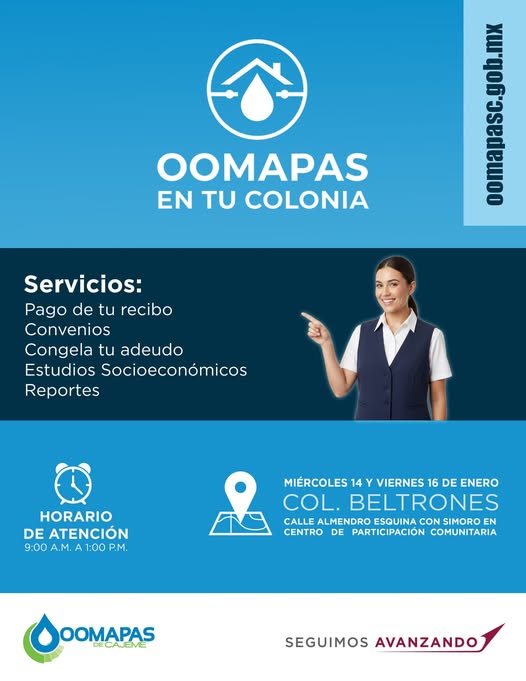 Este MIÉRCOLES 14 y VIERNES 16 de ENERO estaremos en COLONIA BELTRONES con nuestro módulo móvil para pago de recibo de agua, aclaraciones y convenios de pago.
