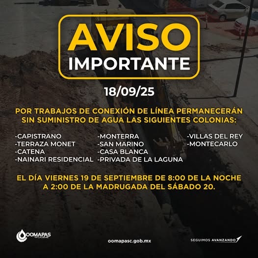 Por trabajos de conexión de línea permanecerán sin suministro de agua las siguientes colonias
