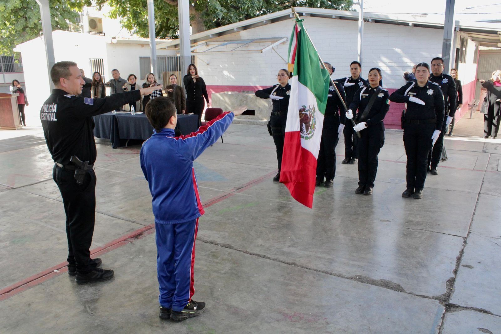 Hermosillo, Sonora, 10 de enero de 2024.- Con el compromiso y participación de 456 niñas y niños de la escuela primaria “Colegio Sonora José La Fountain” de Hermosillo, la Secretaría de Seguridad Pública a través de la Policía Estatal inició el 2024 con el programa que impulsa entre la niñez valores cívicos, respeto y decir no a la violencia informó, María Dolores del Río.