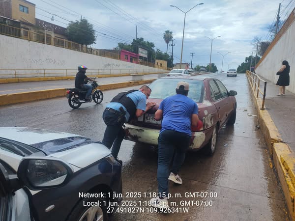 Durante la jornada de lluvias de este día, personal de la Policía y Tránsito Municipal de la SSPM brindó apoyo inmediato a un ciudadano cuyo vehículo quedó varado por una falla mecánica en el paso a desnivel de la calle 200 y a una ciudadana a cambiar la llanta de su vehículo.