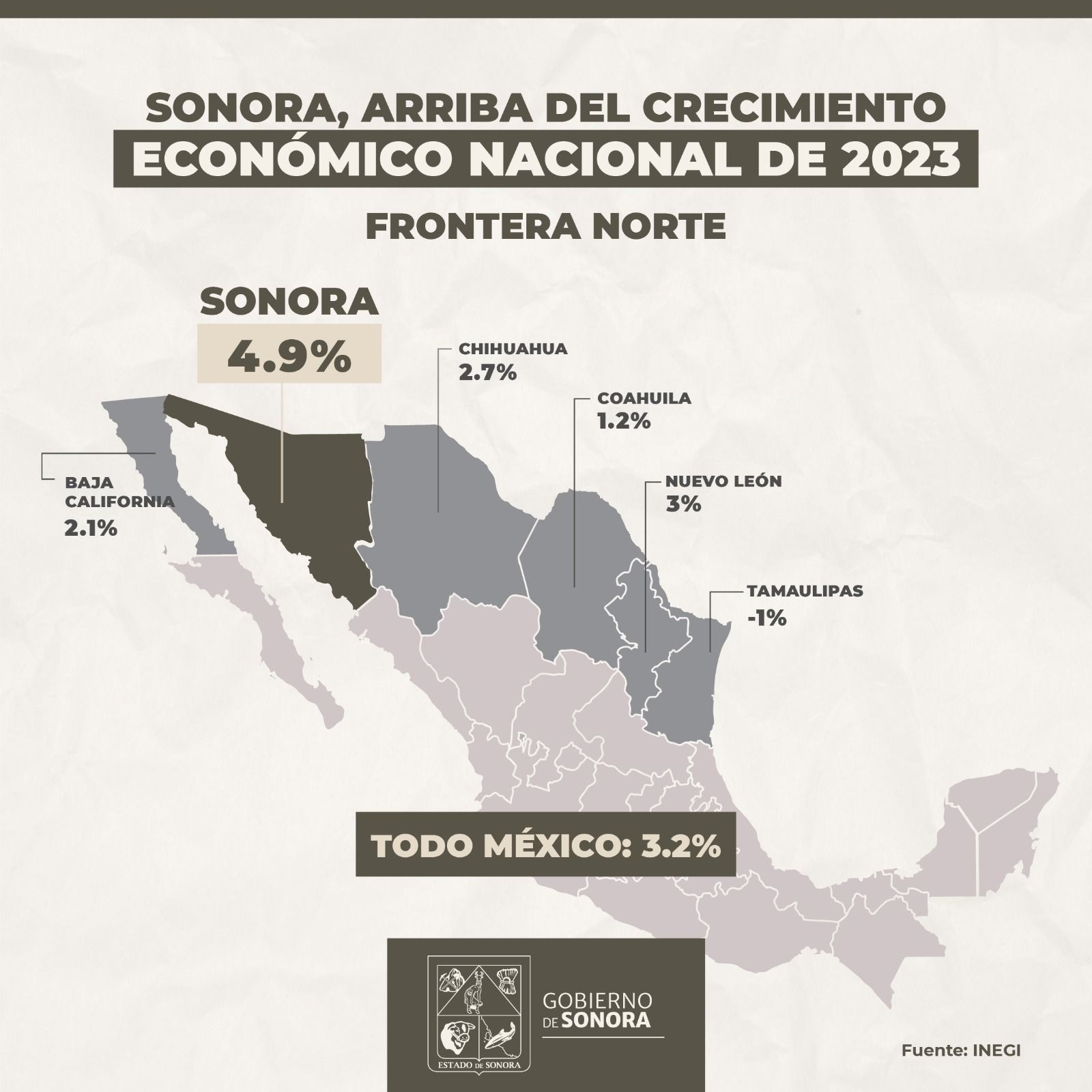 Al darse a conocer el comportamiento de la economía para el cuarto trimestre de 2023, con base a datos a serie detallada, Sonora creció un 4.2% respecto al mismo periodo del año anterior. El crecimiento económico del estado en 2023 obedeció al desarrollo de sectores económicos, donde destaca el nearshoring con un incremento de la construcción anual de un 27% y la manufactura un 7.2%.