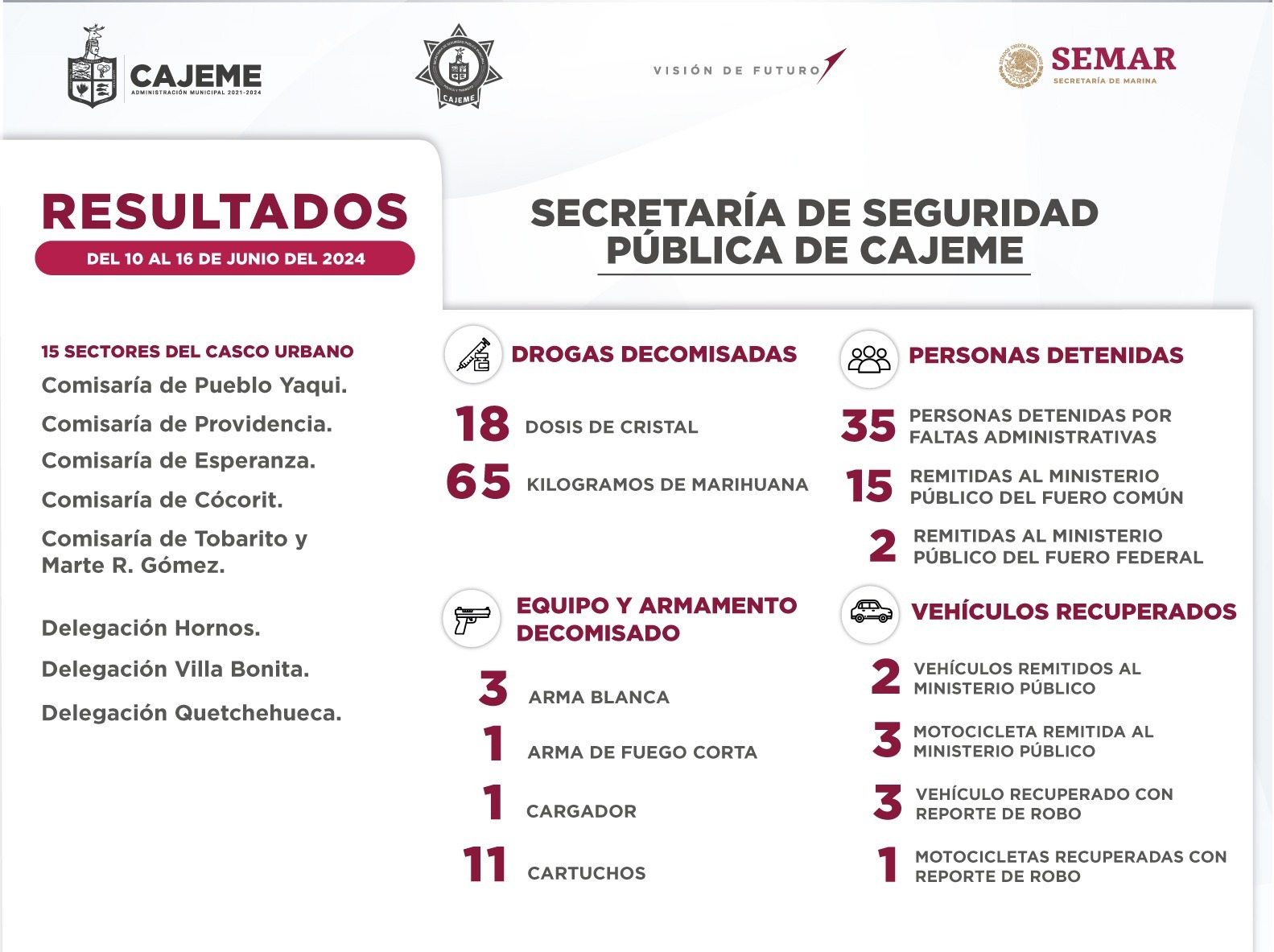 Las acciones de la Secretaría de Seguridad Pública en Cajeme dieron como resultado un total de 52 personas detenidas por elementos de la Policía Municipal en coordinación con la Secretaría de Marina y las diversas corporaciones, de los cuales 35 fueron por faltas administrativas, 15 se turnaron al Ministerio Público del Fuero Común y 2 al Federal.