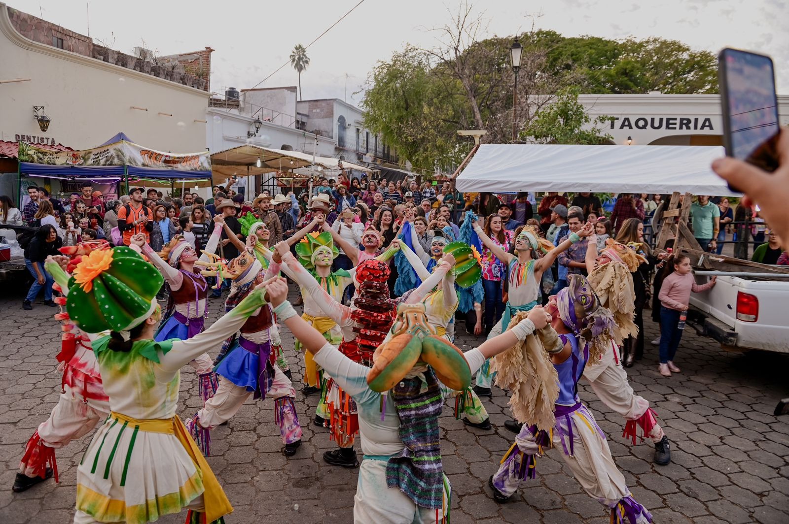 En uno de los más tradicionales rincones de Álamos inició su presentación itinerante la Comparsa Sonora, un proyecto de intervención de la Universidad de Sonora, agrupación que valiéndose de artistas en zancos con representaciones de grupos étnicos, animaron a las personas que pasaban por el lugar a unírseles en el festejo callejero.