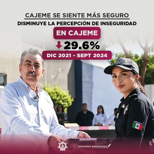 Como resultado de la estrategia implementada por el gobierno de Javier Lamarque y la coordinación de los tres niveles de gobierno, la percepción de inseguridad en #Cajeme bajó 29.6% de diciembre de 2021 a septiembre de 2024, según la encuesta #ENSU del INEGI.