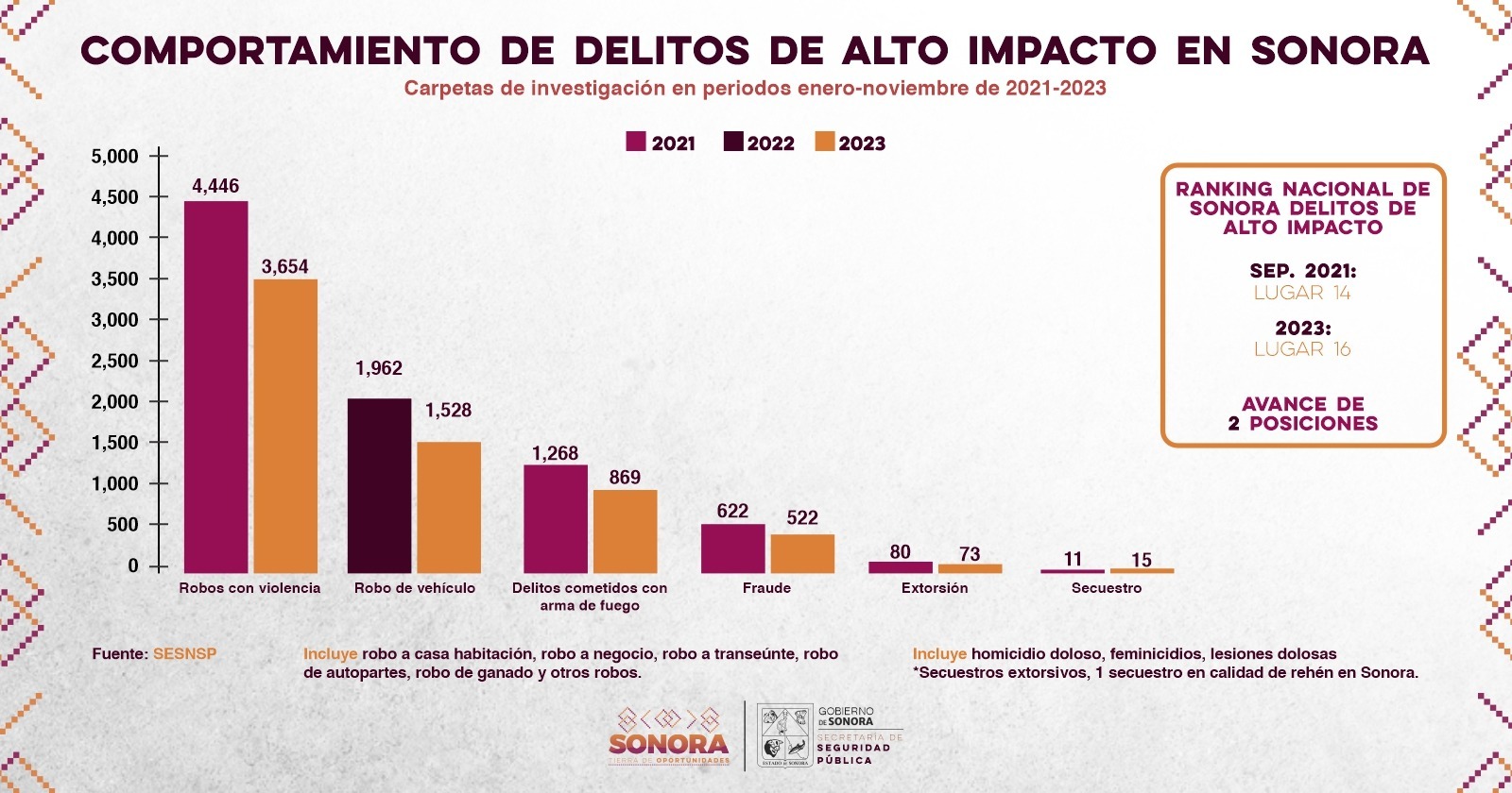 La Secretaría de Seguridad Pública (SSP) de Sonora informó que, en septiembre del 2021 al inicio de la presente administración, la entidad ocupaba el lugar 14 en el ranking nacional de delitos de alto impacto y al cierre del 2023, se ubicó en la posición 16.