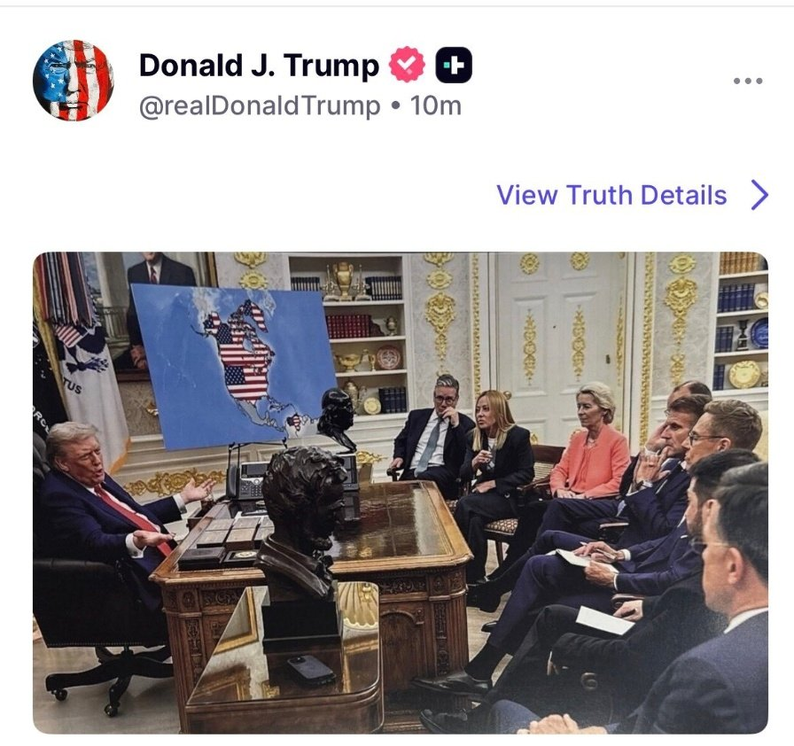 La imagen base corresponde a una reunión celebrada en agosto en el Despacho Oval de la Casa Blanca, donde Trump se reunió con líderes de la Unión Europea y del bloque transatlántico. Sobre esa escena, el mapa ha sido modificado mediante IA para superponer la bandera estadounidense sobre dos potencias aliadas como Canadá y Groenlandia, y sobre Venezuela, país sudamericano con el que Washington ha mantenido una política agresiva en los últimos meses.