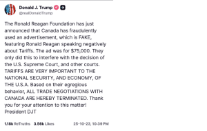 Trump defendió su postura afirmando que “Estados Unidos puede defenderse de los altos y autoritarios aranceles canadienses”, y sostuvo que Reagan “amaba los aranceles por motivos de seguridad nacional y economía”.